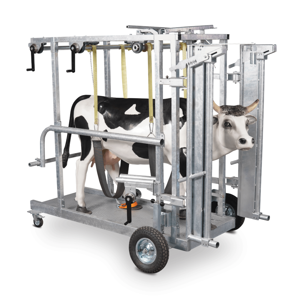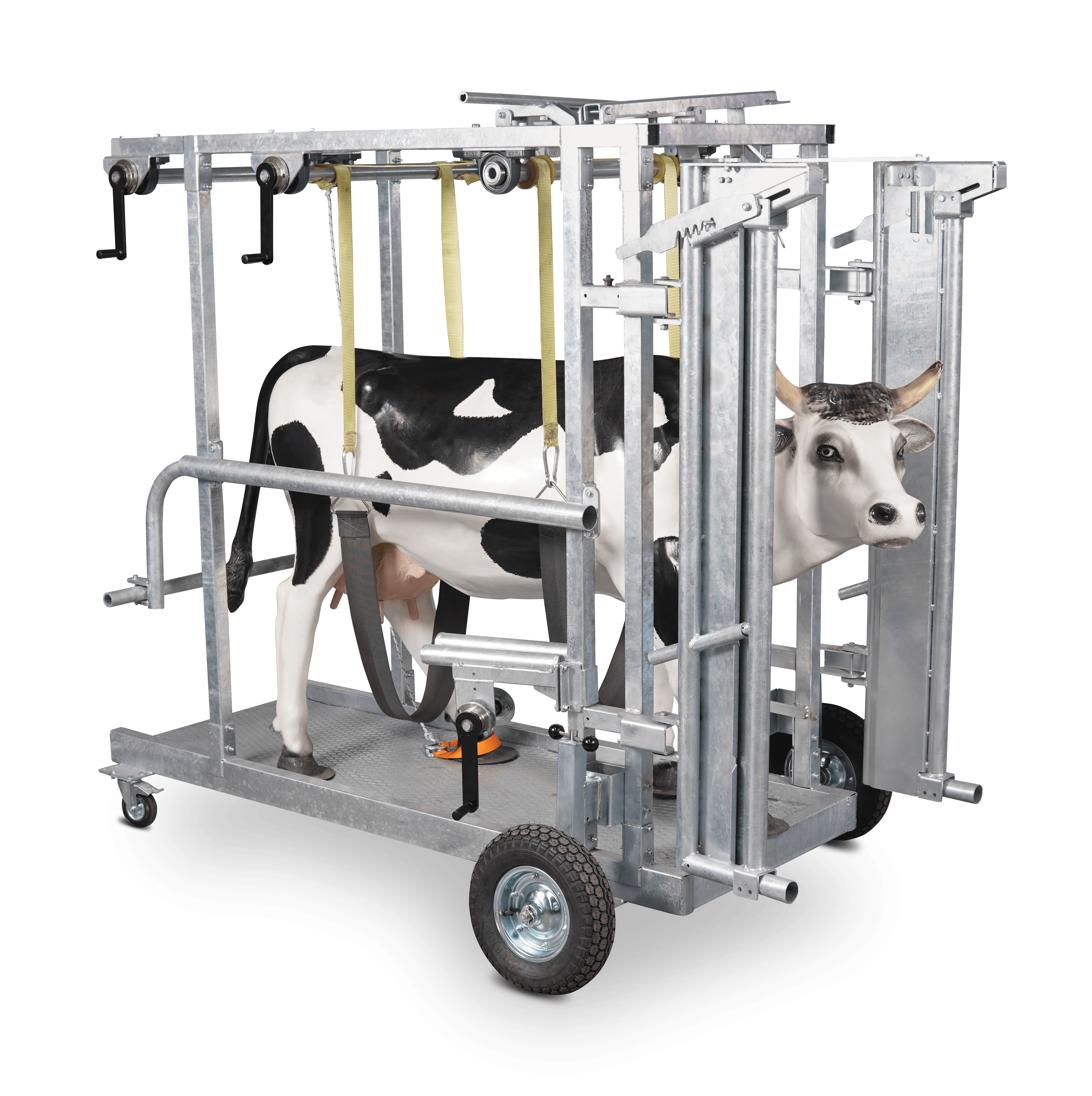 Sığır Kaldırma Aparatı, yere düşmüş veya batmış büyükbaş hayvanları etkili bir şekilde kaldırmak için geliştirilmiştir. Özellikle yatalak ineklerin ayağa kalkmasını sağlamak üzere caraskal veya vinçle uyumlu olarak kullanılabilir. Aparat, hayvanın kalça kemiklerini kavrayarak, vinç veya caraskala bağlı olarak güvenli bir şekilde kaldırılmasını sağlar.