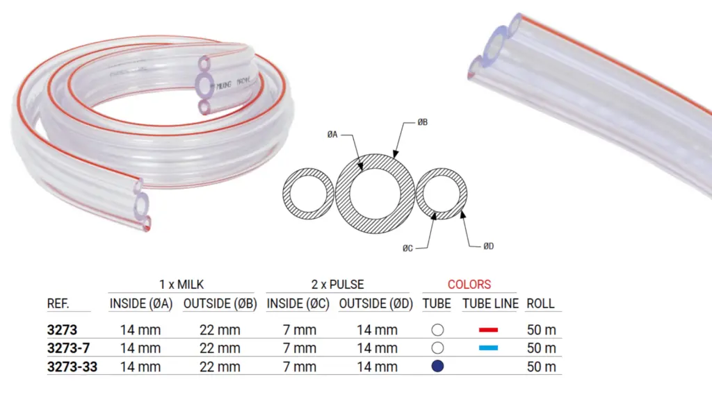 Küçükbaş sağım sistemlerinde kullanılmak üzere yekpare olarak tasarlanmış süt ve tekli nabız hortumu Ø7 x Ø14 mm nabız, Ø14 x Ø22 mm süt hortumundan oluşmaktadır.