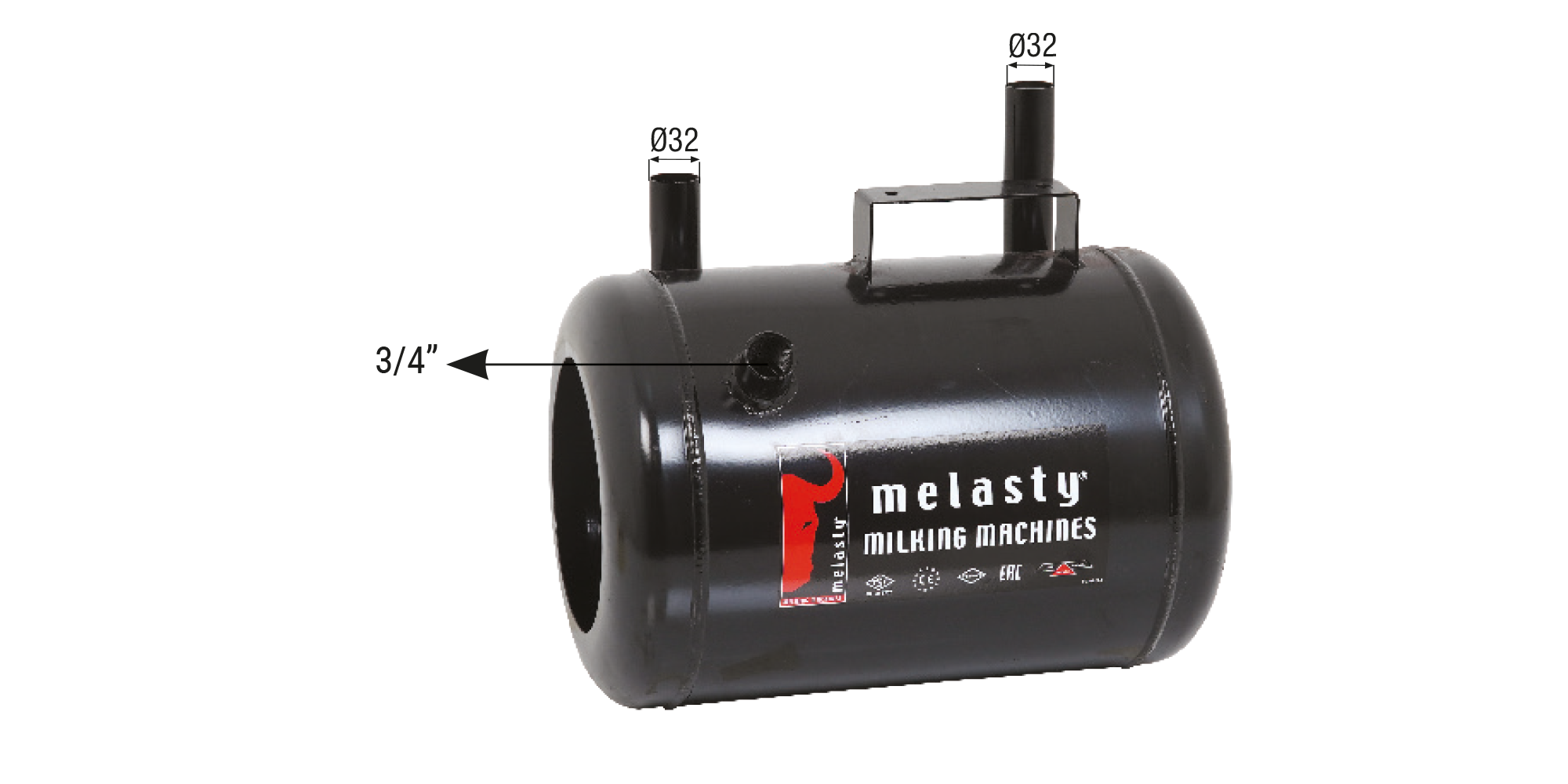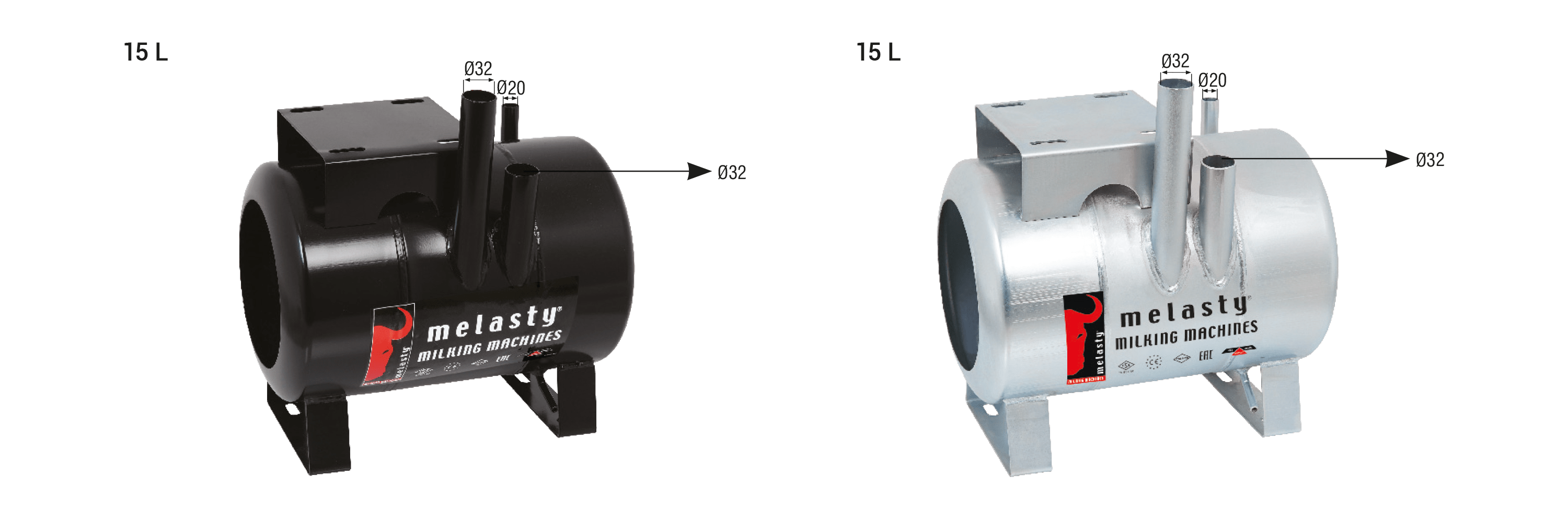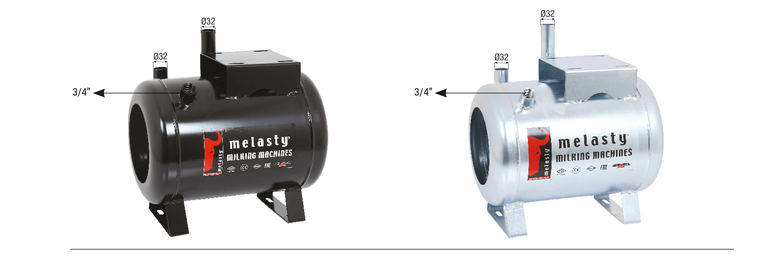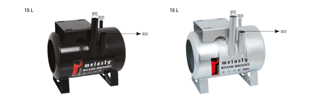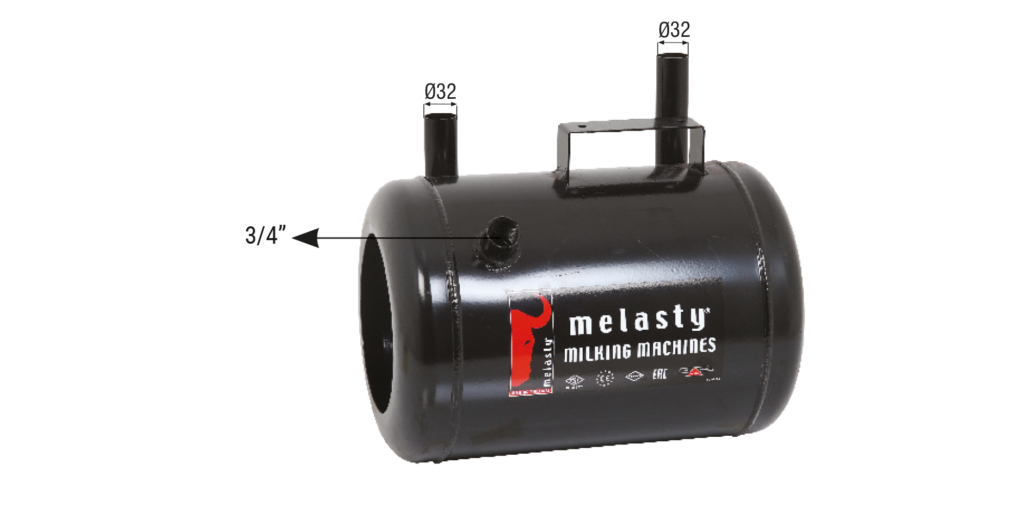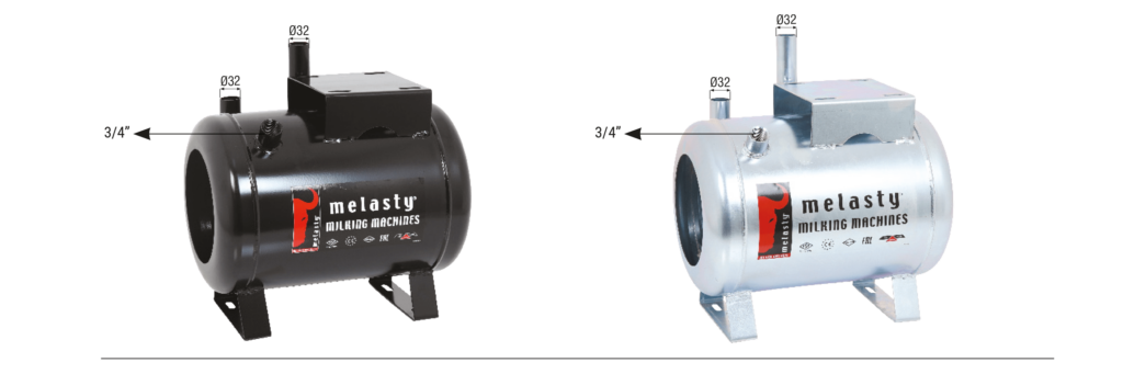 Melasty mobil süt sağım makinelerinde kullanılmakta olan kuru tip vakum tankları 18 L kapasiteye sahiptir. Universal modellerden farklı olarak vakum giriş ve çıkışlarının çapı Ø32 mm olarak tasarlanmıştır. Bu sayede havanın giriş ve çıkışı rahatlatılmış ve performans artışı sağlanmıştır. Vakum tankları kalın sac malzemeden üretilmiş olmakla beraber elektrostatik toz boya ya da galvaniz kaplı şekilde kullanılabilmektedir. Her iki yöntemde korozyona karşı uzun süre dayanım göstermektedir. Vakum tankları kullanılacak makineye göre farklılıklar gösterebilir.